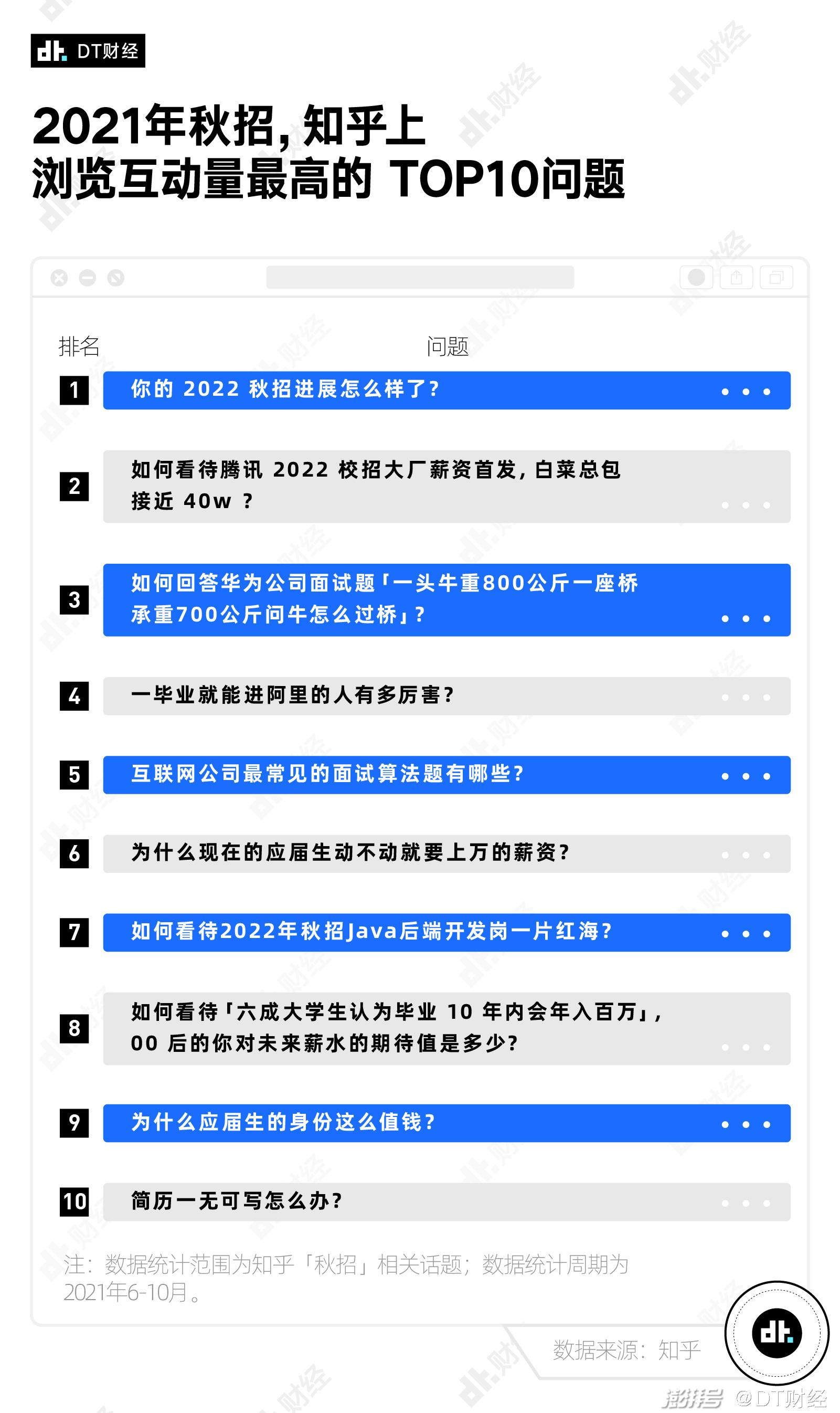 根据统计,今年知乎上关于“秋招”“校园招聘”“应届生求职”等话题词下一共有超过12万条回答和文章,其中近400个问题的阅读量超过了10万次。