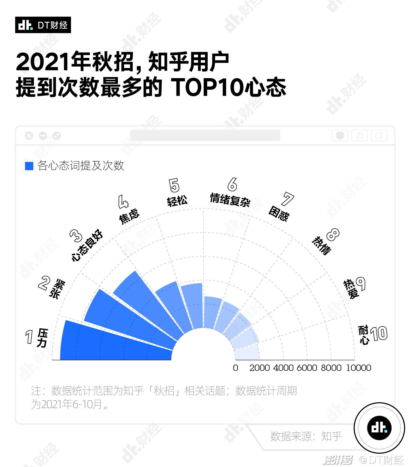 其中,知乎用户在相关回答提到的TOP 10心态关键词中,正面心态和负面心态各占50%。排名前3的心态关键词分别是“压力”“紧张”和“心态良好”。