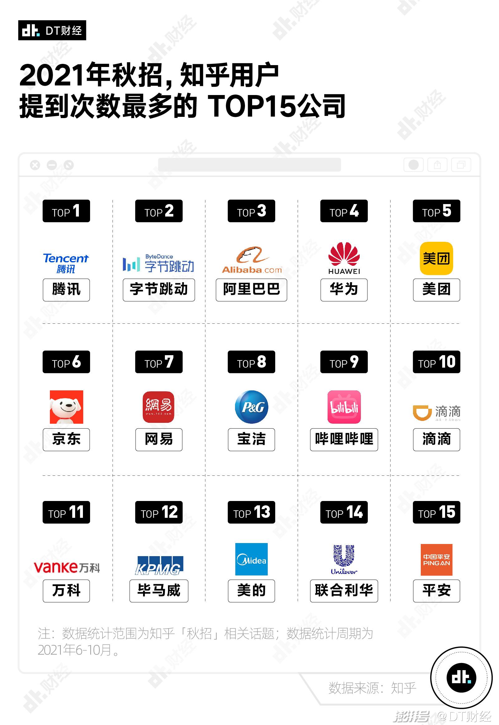 今年秋招,知乎上被讨论次数最多的15家企业中,有8家来自互联网。热度最高的是腾讯和字节跳动,这2家公司均被提及1万次以上,比第3名阿里巴巴多出30%。