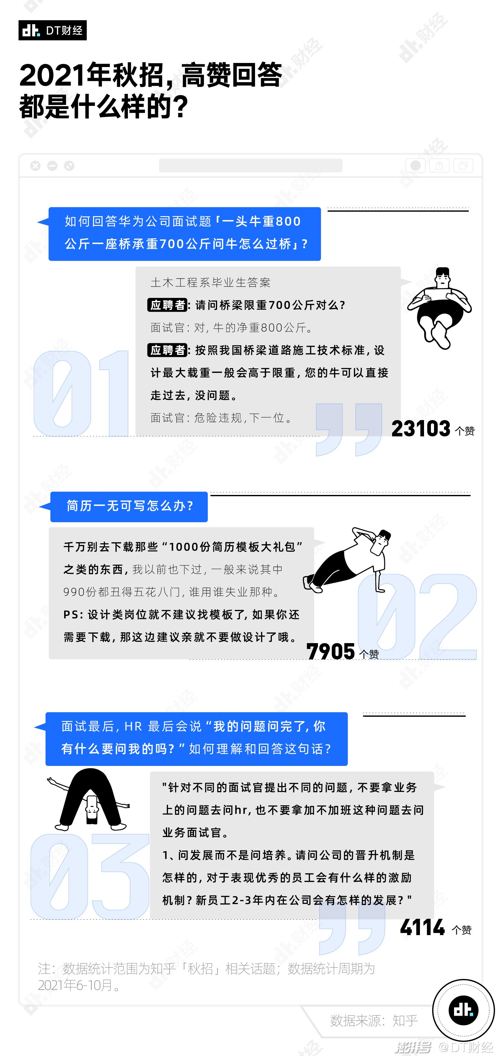 知乎答主 @也说 抓住这一特点,先是活用土木工程、法学、新闻等16个专业的知识,分别模拟应聘者和面试官的对话回答问题,认真中又带有一丝风趣;最后再认真分析企业想要听到的答案,有理有据,让整个答案获得了超2.3万个赞同。