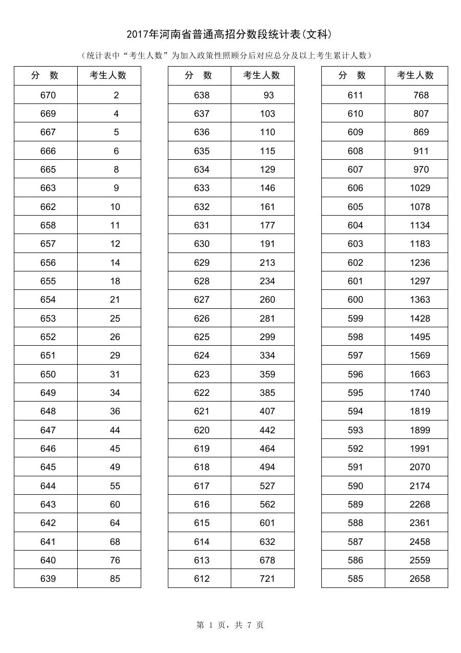 2017年河南高考成绩一分一段表